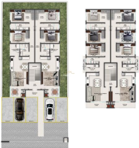 Os apartamentos 201 e 202, terão 3 (três) dormitórios – sendo uma suíte (com 92,44 mts²), banheiro social, sala de estar conjugada com a cozinha, churrasqueira a carvão, circulação íntima e área de serviço.